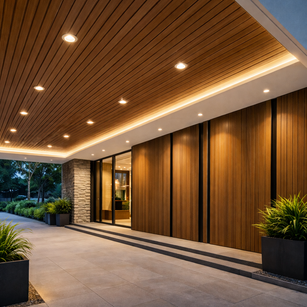 Ecotop Woods® Soffit Ceiling Panels are lightweight, weather-resistant panels crafted to enhance the underside of roof overhangs, balconies, verandas, and exterior corridors. With superior stability, waterproofing, and zero-maintenance performance, these panels are the ideal choice for residential, commercial, and institutional buildings.